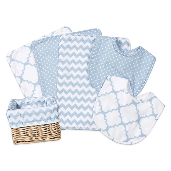 - Bibs, liner, and cloths are 100% soft and absorbent cotton in chevron, dots, and quatrefoil patterns in light blue and white