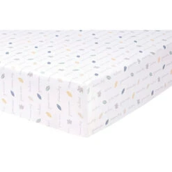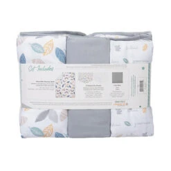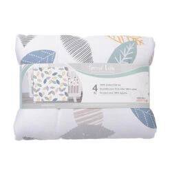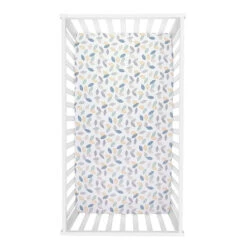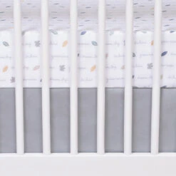 - 1 crib sheet has tiny leave print and encouraging script sentiments