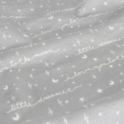 - Features a ‘little dreamer’ and ‘I love you to the moon’ script writing with moons and stars in white on a dove gray background