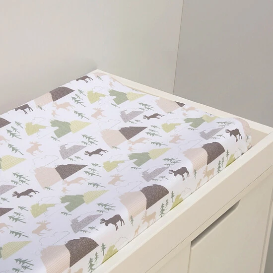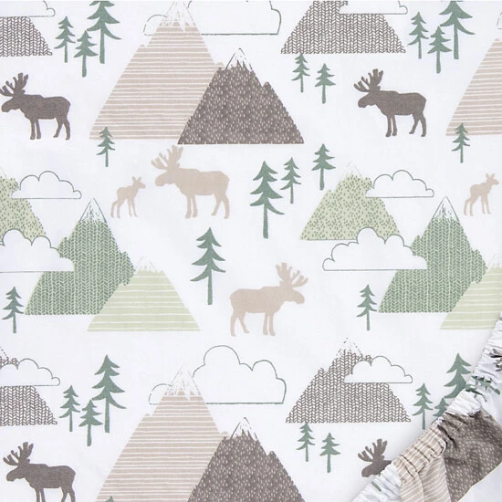 - Features patterned mountains, mama moose, and baby moose with pine trees in greens and grays