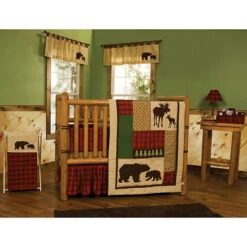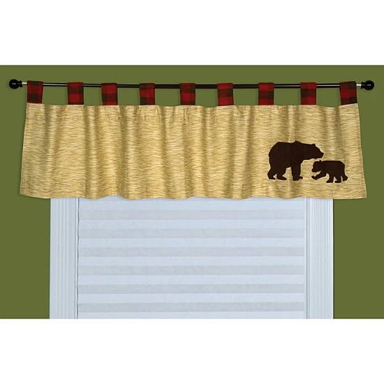 - The Northwoods Window Valance has a sweet mama and baby bear applique in chocolate brown in the lower right corner, over a tan wood grain print; as well as red and brown buffalo check tabs for a truly rustic look