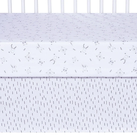 - Crib skirt: 100% cotton; 28" W x 52" L x 13" drop