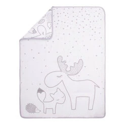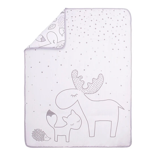 - Reversible quilt features a with cute large moose, fox, and hedgehog print