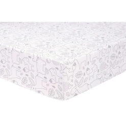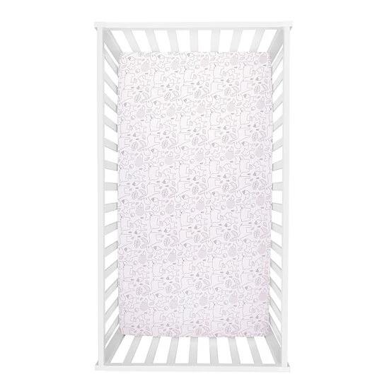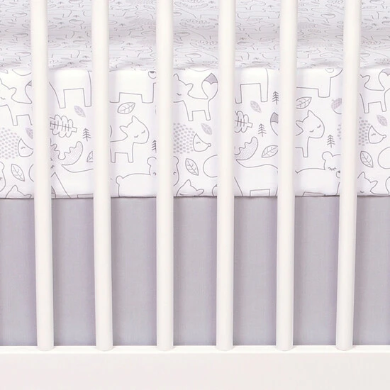 - 1 crib sheet has a forest animals scatter print in grey on white