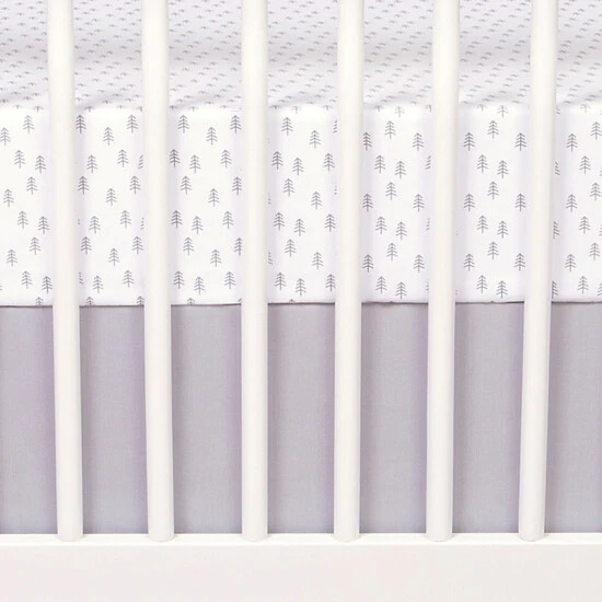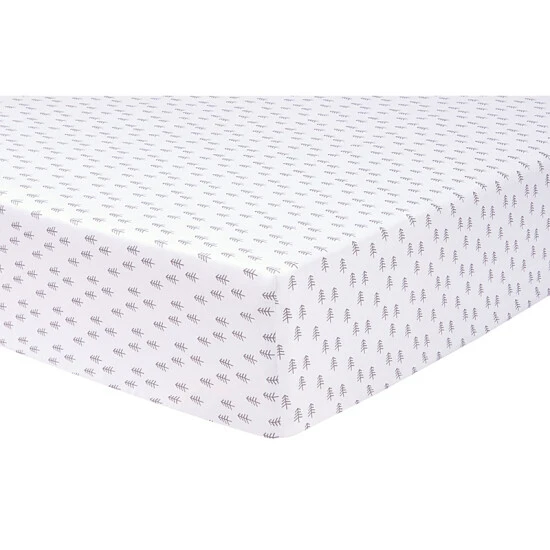- 1 crib sheet has forest trees print in grey on white