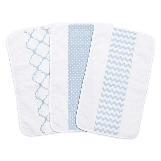 - Soft 100% cotton terry cloth include chevron, dots, and quatrefoil prints in blue sky
