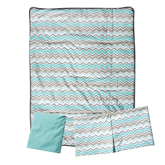 - Box-pleat crib skirt in aqua and grey chevron, 28″ W x 52″ L with 13″ drop