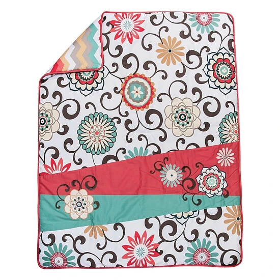 - Appliqued and embroidered floral quilt that reverses to chevron print measuring 35″ W x 45″ L