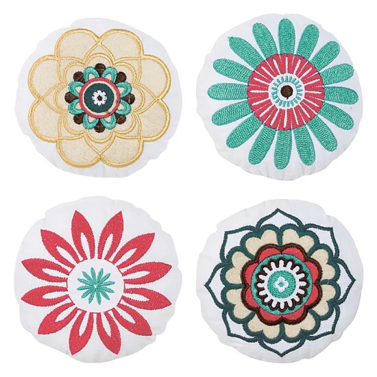 - 4 plush embroidered flowers are suspended from a decorative white ribbon and slowly rotate